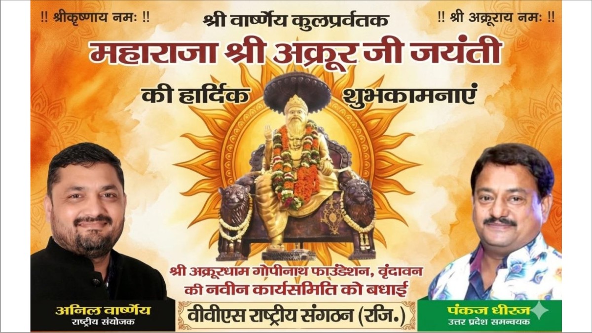 अपने संदेश में उन्होंने कहा कि श्री अक्रूर जी महाराज वार्ष्णेय समाज के कुल प्रवर्तक और प्रेरणास्रोत हैं। उनके आदर्श हमें एकता, सेवा और संस्कारों के मार्ग पर चलने की प्रेरणा देते हैं।