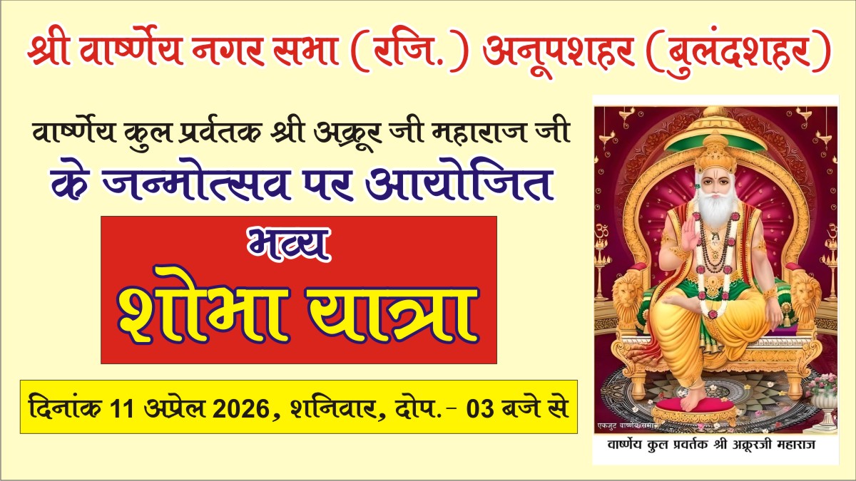 अनूपशहर (बुलंदशहर): श्री वार्ष्णेय नगर सभा (पंजी), अनूपशहर के तत्वावधान में श्री अक्रूर जी महाराज की जयंती के उपलक्ष्य में 11 अप्रैल 2026 को भव्य शोभा यात्रा का आयोजन किया जा रहा है।